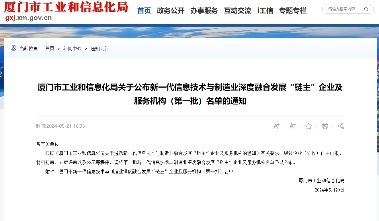 近期,厦门市工业和信息化局公示了【厦门市新一代信息技术与制造业融合开展“链主”企业及服务组织(第一批)名单】的遴选结果,乐发lv大众 乐发welcome凭借专业的数字化转型服务能力和高质量的落地服务经验,入选厦门市首批“新一代信息技术与制造业深度融合开展云服务商(平台)”。