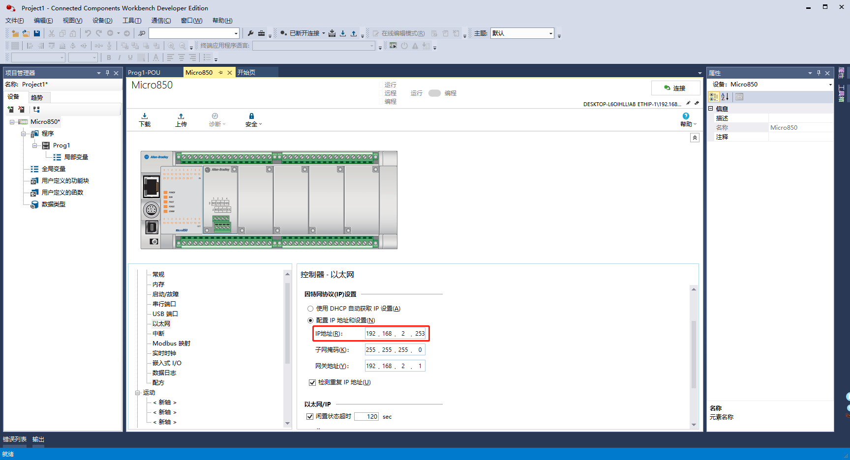1、Allen-Bradley Micro850与电脑顺利获得网络连接,利用Connected Components Workbench获取与设置IP地址、子网掩码与默认网关。
