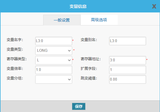 PLC采用网口通信时,变量配置主要填写变量名(网口协议较为特殊,需配置成与PLC内的变量名一致)、变量别名(自定义,建议使用中文),寄存器类型和寄存器地址无需配置(默认即可),可定义一些数据规则(如:倍率、小数点、单位、报警规则等)。