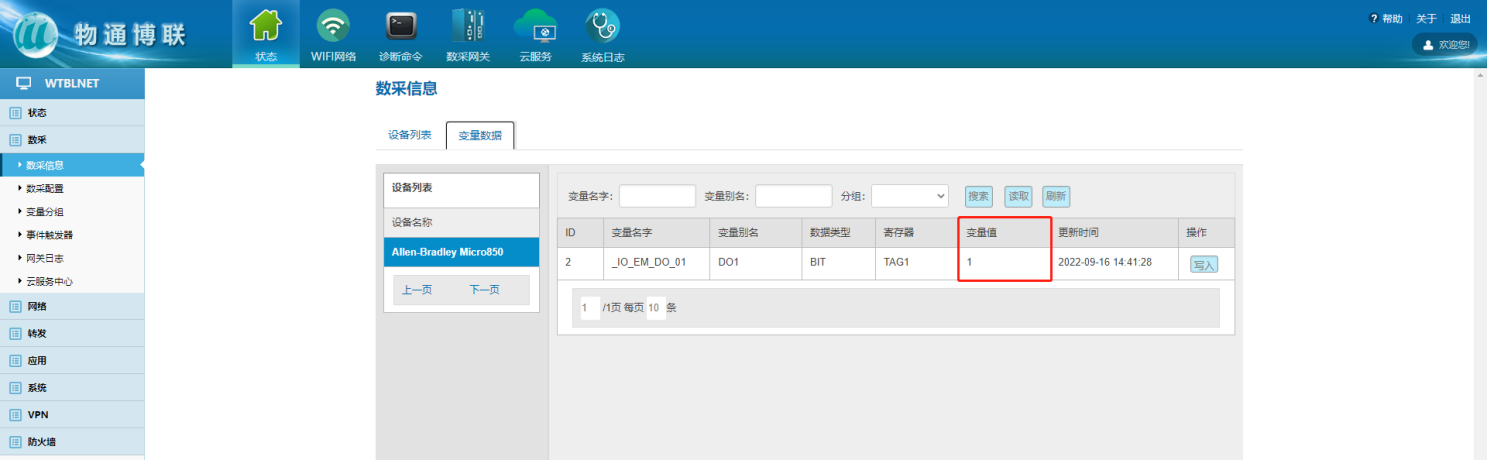 数采配置(设备信息+变量参数)完成后,重启采集程序并生效配置,即可在:数采信息—变量数据—设备名称中看到采集上来的数据。