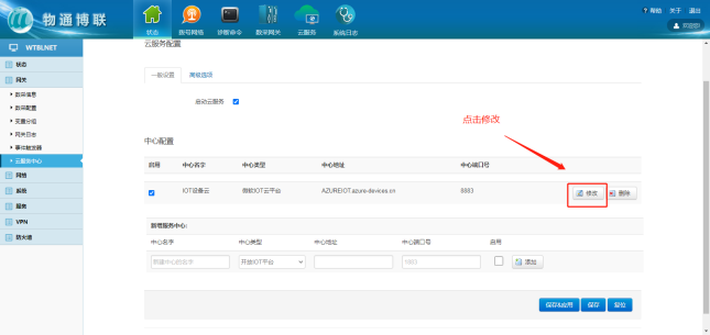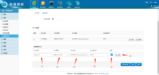 选择“微软云平台”,打开乐发lv大众 乐发welcome网关WEB界面,新建一个连接中心,中心类型选择微软IoT云平台,输入相应信息,勾选启用,点击“添加”