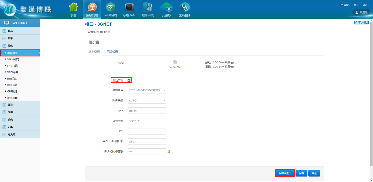 下载中心 视频中心 常见问题 售后服务 工业网关 设备快线 数据云平台 联网设备 问答百科 工业智能网关如何使用流量卡上网? 时间:2022-10-26 09:15:30 点击:4981 关键词:工业网关,流量卡,网关配置 问题:工业智能网关如何使用流量卡上网? 回答: (1)电脑顺利获得网线接入到网关LAN口,浏览器输入192.168.2.1默认地址 (2)登陆到网关配置界面,点击网络—拨号网络—自动开启—保存应用 上一篇:工业智能网关如何连接wifi热点? 下一篇: 工业智能网关如何使用网线上网?