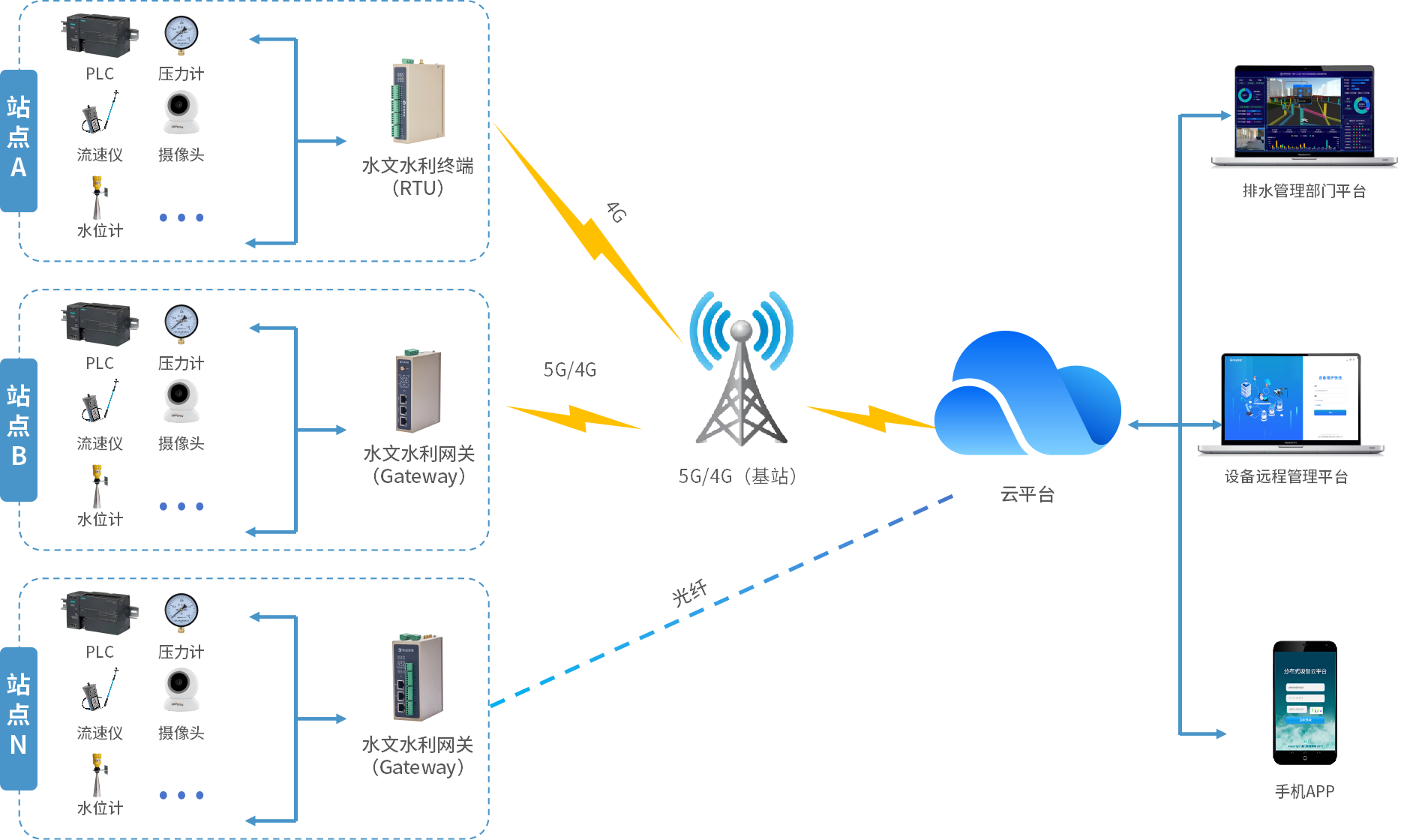 城市排水管口以及关键交汇口部署监测站(水位计、流量计、流速仪、压力计等),接入乐发lv大众 乐发welcome水文水利网关(RTU),实时采集水位、流量、流速、水压等数据并顺利获得5G/4G或光纤网络远程传送至排水管理部门平台,实现远程监控、超限告警、设备定位等功能,管理人员可以随时分析城区各区域排水管网运行状态并解决漏损问题,既满足排水管网日差巡查的管理需求,也能确保暴雨汛期时排水管网的正常运行性能,为预防城市内涝做出可靠贡献。