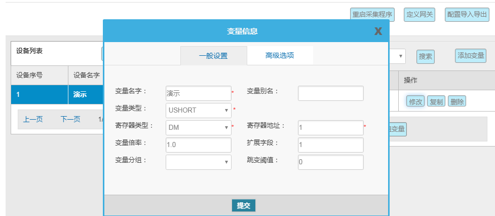 变量配置主要是定义变量名(自定义内容,不可使用中文命名)、变量别名(自定义,可使用中文名字)、寄存器类型和寄存器偏移地址,并定义一些数据规则(如:倍率、小数点、单位、告警)。