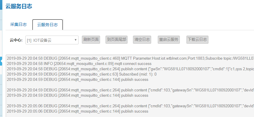 日志设置路径:网关---云服务中心---云接入调试等级与采集调试等级.为了保证网关快速高效采集,调试完毕后请务必将网关采集日志和云接入日志等级调整为信息。