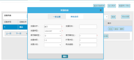 变量配置主要是定义变量名(自定义内容,不可使用中文命名)、变量别名(自定义,可使用中文名字)、寄存器类型和寄存器偏移地址,并定义一些数据规则(如:倍率、小数点、单位、告警)。