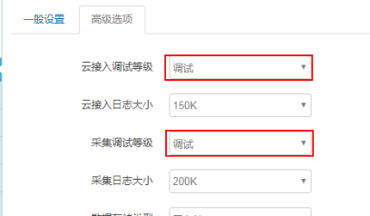 日志设置路径:网关---云服务中心---云接入调试等级与采集调试等级.为了保证网关快速高效采集,调试完毕后请务必将网关采集日志和云接入日志等级调整为信息。