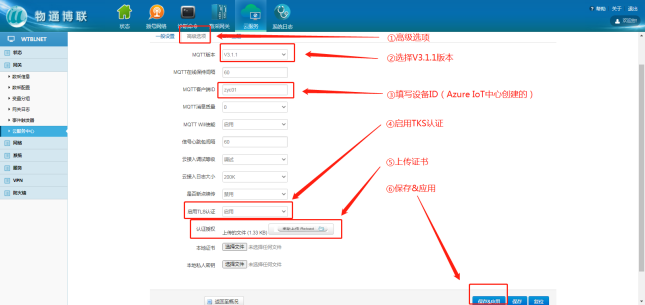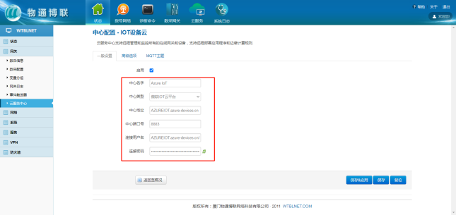 选择“微软云平台”,打开乐发lv大众 乐发welcome网关WEB界面,新建一个连接中心,中心类型选择微软IoT云平台,输入相应信息,勾选启用,点击“添加”