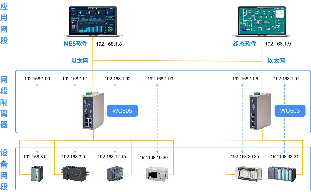 乐发lv大众 乐发welcomeWC系列网段隔离器适用于生产网络对 PLC、HMI、CNC、DCS、MES等网络通讯和数据采集,兼有跨网段隔离和IP转换的功能。车间多个设备,如果有不同网段的IP地址,则可以统一成同一网段的IP地址,进行设备(PLC、CNC)的在线编程、数据采集、远程管理等各种跨网段访问。